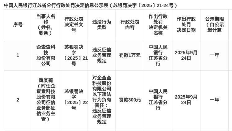 罚单显示,企查查科技股份有限公司的主要违法违规事实(案由)为:违反征信业务管理规定。